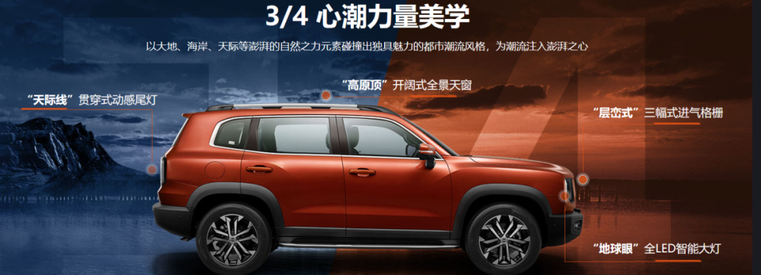 目前,市面上的城市SUV和越野车之间存在明显的壁垒,城市SUV为了舒适性,妥协了通过能力;硬派越野车为了潮流,妥协了操控和经济性。千篇一律的产品设定,束缚了后浪们的选择。 在SUV市场陷入僵局之际,哈弗品牌依靠多年经验积累,在2/4刻度与4/4刻度之间洞察到一个有待开拓的细分蓝海市场,并率先推出“3/4刻度座驾”,为消费者带来更优、更完美的选择。 目前哈弗大狗共有4款车型在售,分别是哈士奇版,拉布拉多版,边牧版以及马犬版,已经上市的四个版本车型搭载1.5GDIT发动机+7DCT双离合变速箱,中国心十佳动力和世界十佳变速器结合,可以爆发出124kW和285Nm超强动力输出性能。 哈弗全新品类SUV的到来,自然让年轻的后浪们眼前一亮,其兼具城市SUV和硬派越野车的优势,轻松应对从城市到越野的全部场景,满足多样化的出行需求,完美契合后浪们有追求、不将就的生活态度。 从“生存”到“生活”,后浪们只差一台哈弗大狗。 不仅如此,哈弗大狗这个大胆创新的全新命名,与哈弗全新品类SUV年轻、潮流、极具亲和力的品牌调性完美契合,为产品快速打响知名度之余,还帮助品牌吸粉无数。 ![]() ![]() ![]() ![]() (揭布仪式) 当然,一款让年轻人满意的座驾,除了有精准定位与营销造势还不够,更要有过硬的产品力为基石。哈弗大狗采用的是全新长城柠檬平台,用了5年时间,花了百亿进行研发,集合了哈弗最先进造车技。 新潮年轻人选车,颜值是第一关。这款3/4刻度座驾也由前路虎设计总监、现长城汽车全球设计总监兼副总裁菲尔∙西蒙斯亲自操刀设计,基于新时代年轻人追求越野的生活需求,采用全新的“心潮力量美学”设计理念倾心打造,使整车潮酷有型。 从外观来看,新车融合了复古与时尚、精致与野性的“心潮力量美学”设计,采用了大量的平直线条设计,配合引擎盖上隆起的筋线、大尺寸三横式进气格栅、粗犷的下护板都让新车外观显得十分具有力量感,透露出极为强悍的硬派越野气场。 而前脸最为标志型的大灯采用了内圆外方式的设计,精致的复古风格.车身侧面简单利落,完全没有多余的点缀。同时哈弗大狗采用了常用于硬派越野车上的黑色轮眉,走烂路也不用担心划伤车身,搭配上全新样式的五辐轮圈,野性中又透漏着一丝精致感。其外观设计灵感均来自大自然,引领潮流审美价值,开创潮野新时代。